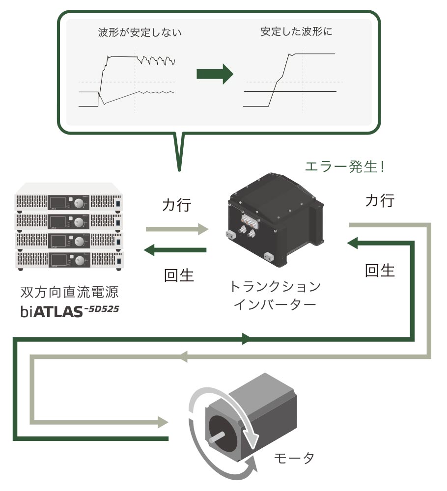 - モータインバータの評価を行っているが、カ行⇔回生時にインバータからエラー信号が出て動作が停止し、評価が実施できない。