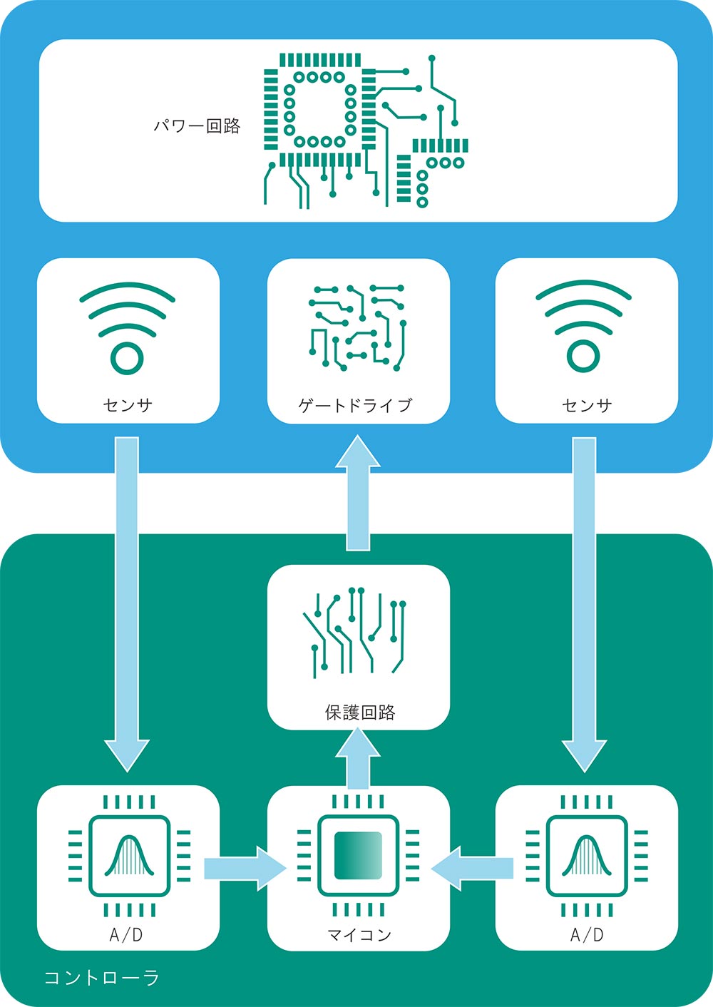 太陽光発電のパワーコンディショナーや電気自動車のモータドライブインバータをはじめとするパワーエレクトロニクス(パワエレ)機器は、高度なコントローラが内蔵される組み込み機器の一例であります。これらに内蔵されるコントローラは、CPU、メモリ、パルス生成器、ADコンバータといった機能を有しており、これにより機器の動作は精密に制御されます。近年では、これらの全機能を搭載したマイコンの使用が一般的になり、パワエレ専用に設計されたマイコンも開発されています。