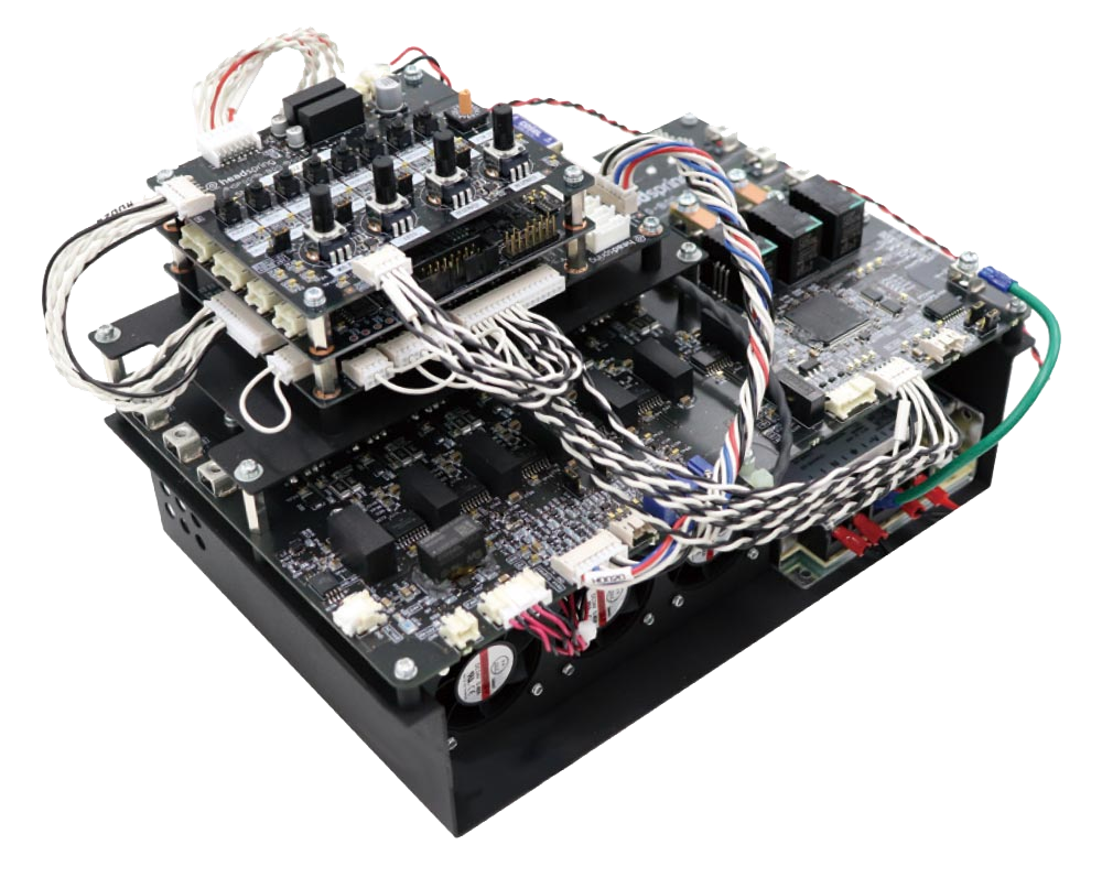 SiC 三相インバータとコントローラ、サンプルソフトウェア等を組み合わせて、制御用のAC100V を投入するだけで三相インバータとして動作させられるようにしたセットです。ROHM 製第4 世代SiC-MOSFET を6 個搭載した三相フルブリッジインバータで、最大定格電力18kVA での動作が可能です。24V の制御電源とサンプルソフトが付属します。