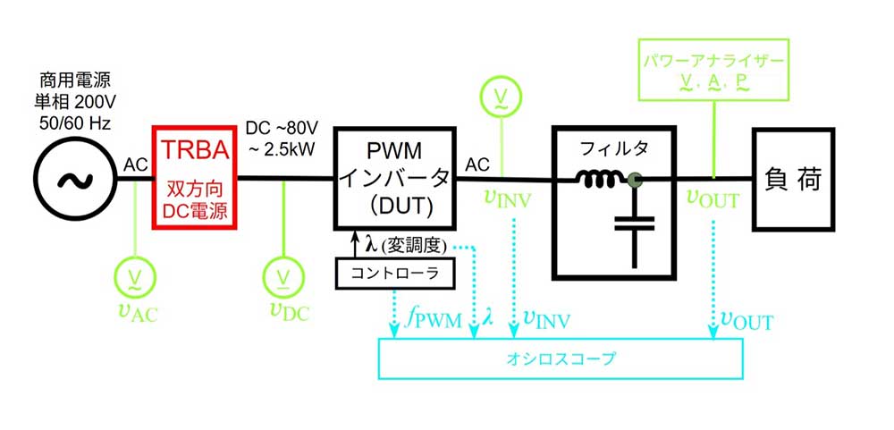 TRBA は、単相商用電源環境において直流電源を提供する双方向 AC–DC 電源であり、図2に示した構成例では、PWM インバータの開発・評価用直流電源として用いています。単相電源環境でありながら、被試験装置の動作確認や挙動評価に必要となる電圧および電力条件を柔軟に設定できる点は、開発・評価用途における試験電源として有効です。