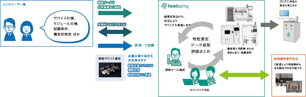 ヘッドスプリングでは、半導体・電子部品の信頼性テストの装置販売、導入支援に加え、テスト実施の支援も行っています。当社は、創業以来、SiCやGaN を含めた様々なデバイスを活用し、スマート エネルギーや電気自動車(EV)等、各種アプリケーション向けの電力変換器等のコンポーネント開発を400 件以上実施してきた会社です。その経験を基に、アプリケーション毎に異なるテスト項目のご相談からテストの実施、結果分析まで、様々なご要望や課題に合わせた対応が可能です。例えば、パッケージ技術やその素材・プロセス等を開発されている会社様等で、スポット的な評価や評価装置導入前後の結果確認等の必要性がございましたら、是非、お気軽にご相談くださいませ。